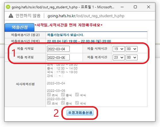 3. ÀÚ½ÅÀÇ ¿ÜÃâÀÏÁ¤¿¡ ¸ÂÃß¾î ½ÃÀÛ°ú º¹±ÍÀÏÀ» Ŭ¸¯ ÈÄ ½Åû¹öư Ŭ¸¯